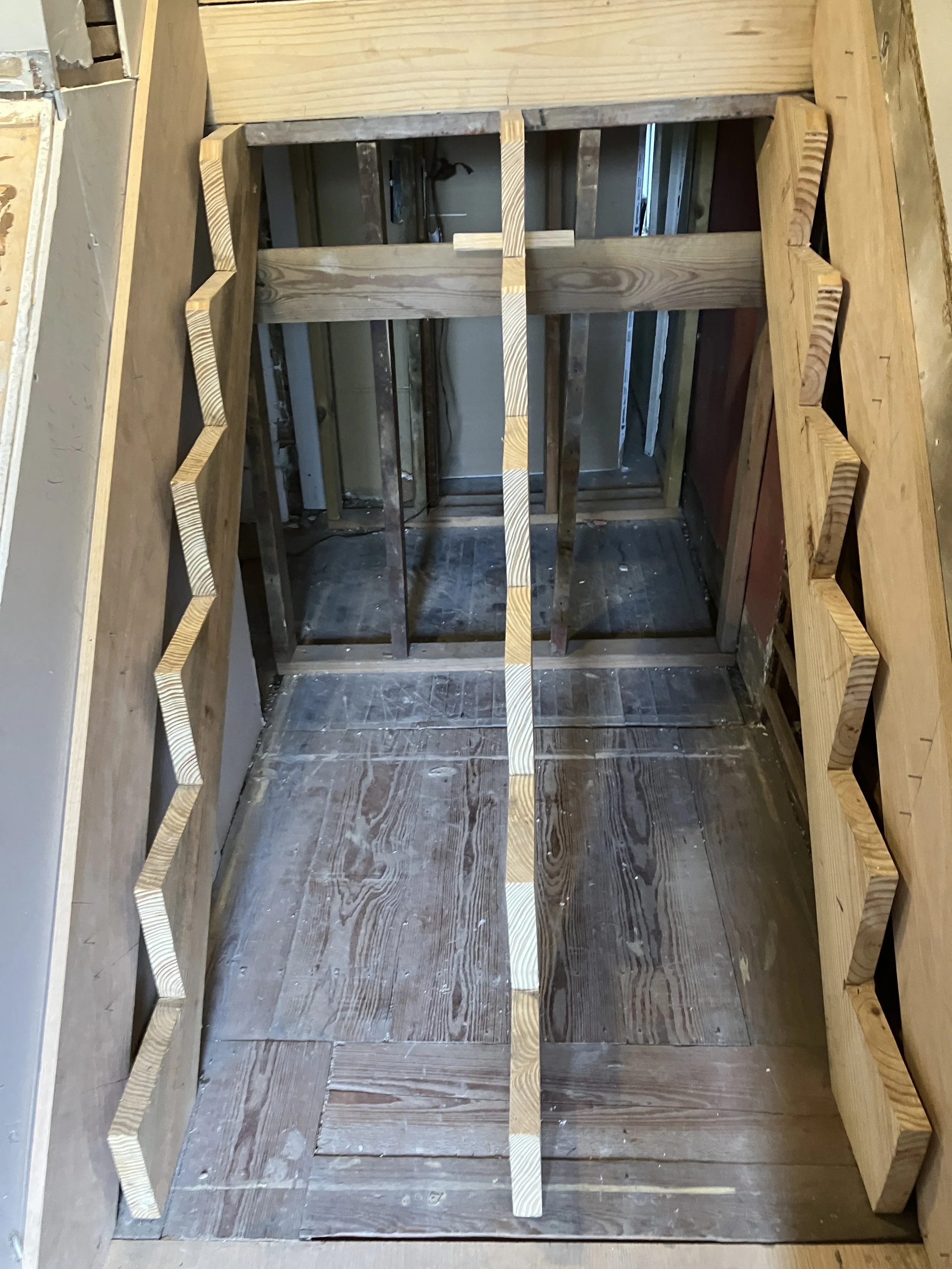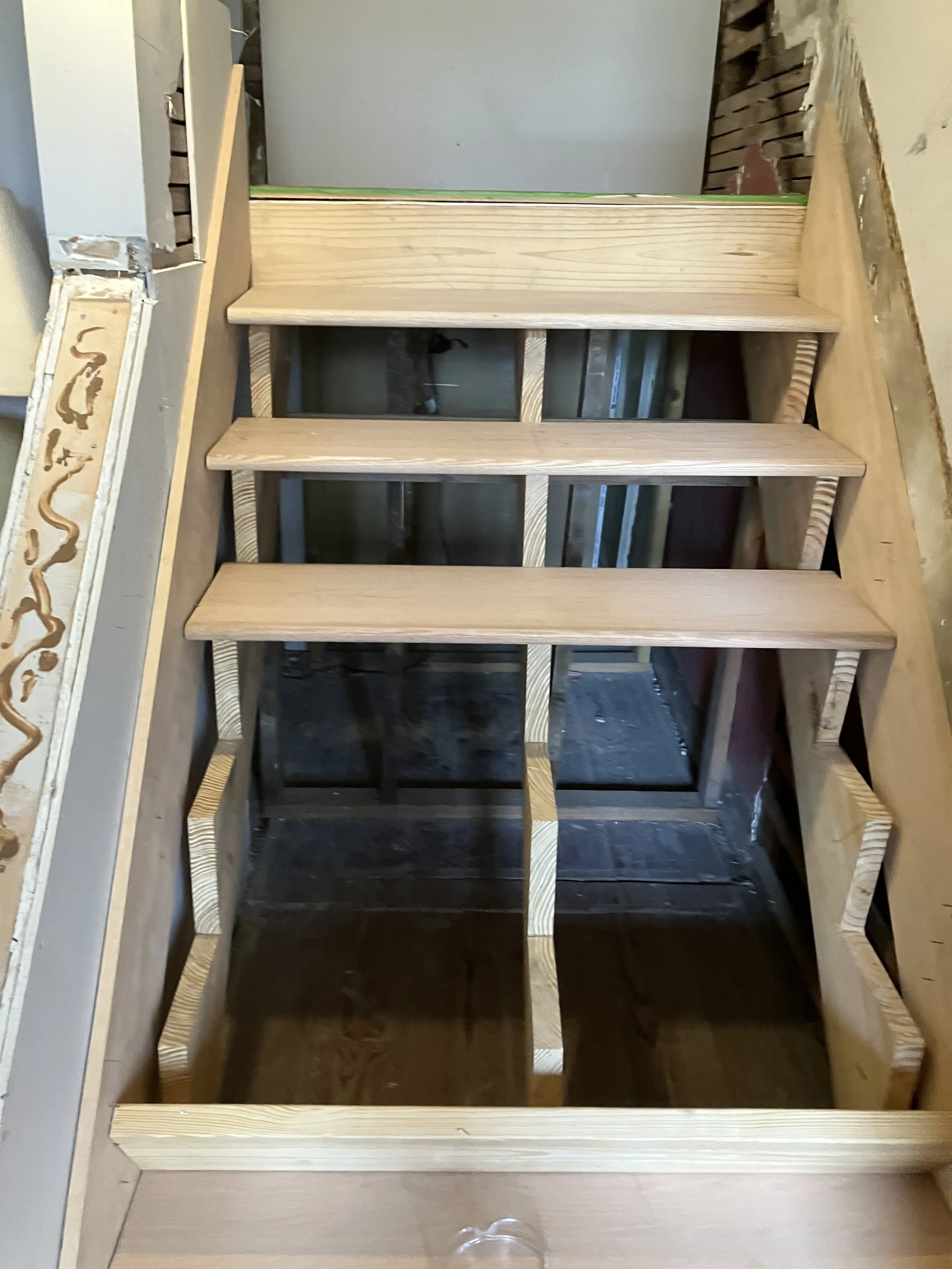 Duplex Stair Replacement – Like much of the community, the buildings that are part of the Fox Creek Properties portfolio were built one hundred years ago. Duplexes and smaller homes for working folks share details with the larger homes for executive that are located in the center of the community. The previous owner of the portfolio modified the staircase to the second floor, making it illegal. With the assistance of Russell Baltimore, a new L-shaped staircase was designed to fit within the space for the noncompliant. Jay converted Russell’s drawing to detailed dimensions and built the new stair. Trim details have yet to be installed, but will be installed when work on the second-floor unit begins.