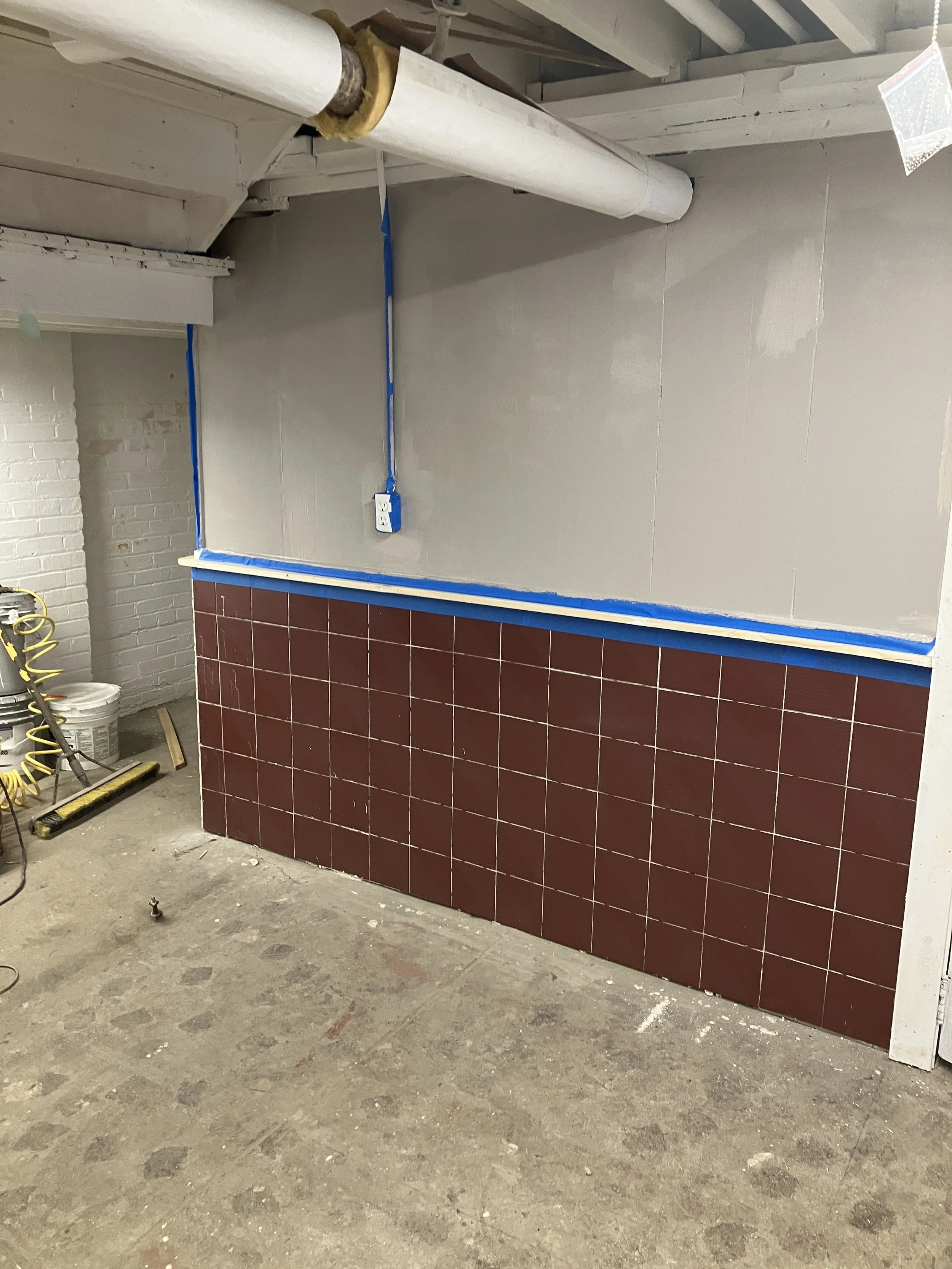 Basement Improvements – A second project renovated the Basement and included the enclosure of Bathroom fixtures with new walls built with pressure treat rough construction and finished with ceramic tile wainscotting. The selection of materials will provide more resiliency following future basement back-ups. Tile colors were selected to continue the scheme on the outside of the home and now, walls can simply be washed down and will not have to be removed due to water damage to drywall and other materials. Work in the basement included painting the joists white to liven the space and new light fixtures throughout the space.